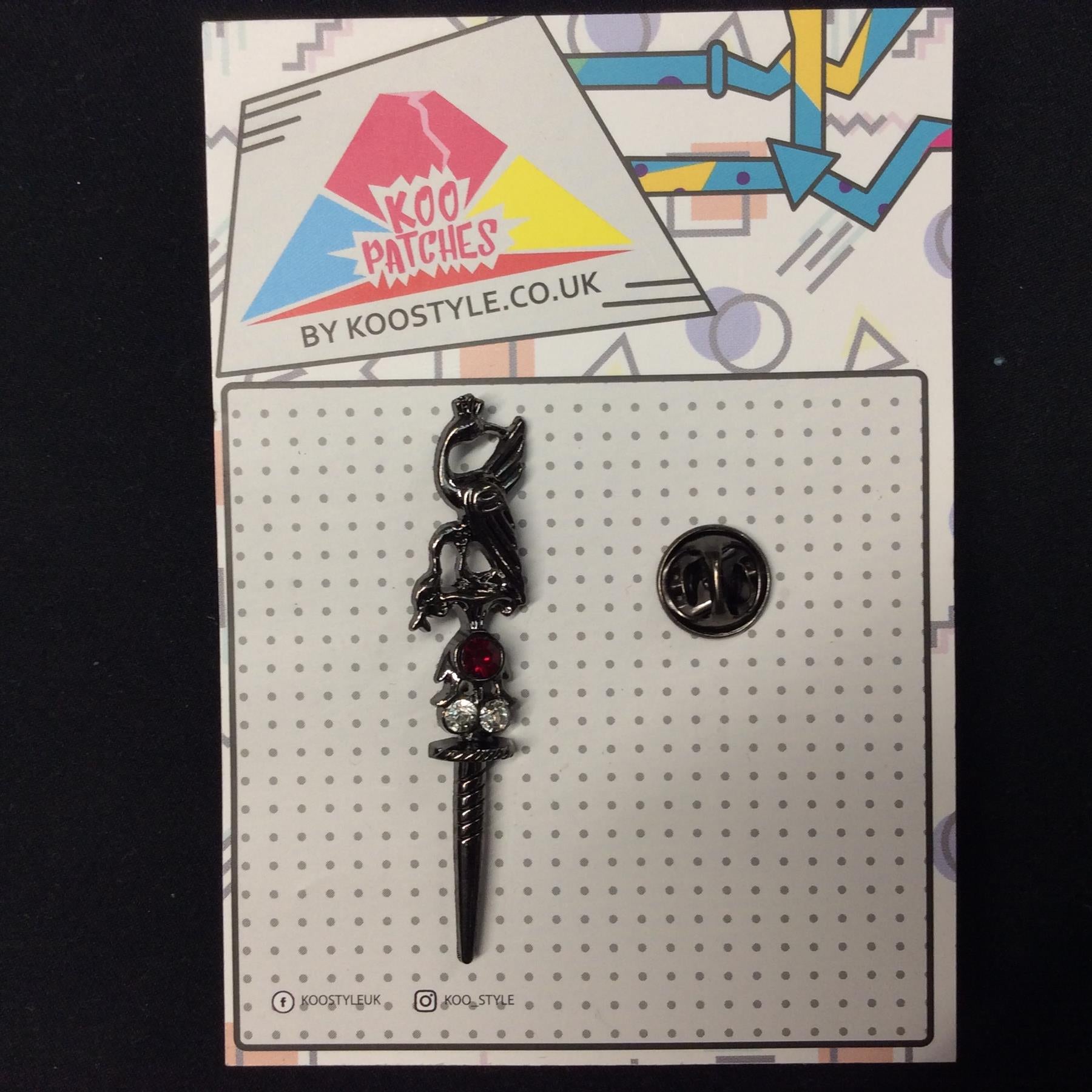 MP0144B - Black Gold Bird Red Gem Stone Sword Metal Pin Badge